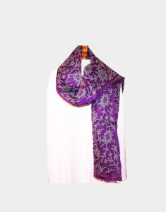 This unique silk scarf is fully handcrafted by Indian artisans. Each scarf is uniquely color dyed, then block printed and embroidered on printed motifs to give a nice relief. Its elegant and intricate embroidery will make you stand out while wearing it. It is very lightweight, so can be worn during any season. The word “kantha” in Bengali means an embroidered quilt traditionally used in adorning quilts. Kantha is a style of embroidery that originates from Bolpur in the Birbhum district of West Bengal, India. It is usually a simple running stitch done with various colored thread on solid colored fabric. Dry clean recommended. Color: purple, grey. Size: 21″ x 72″