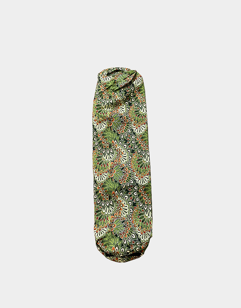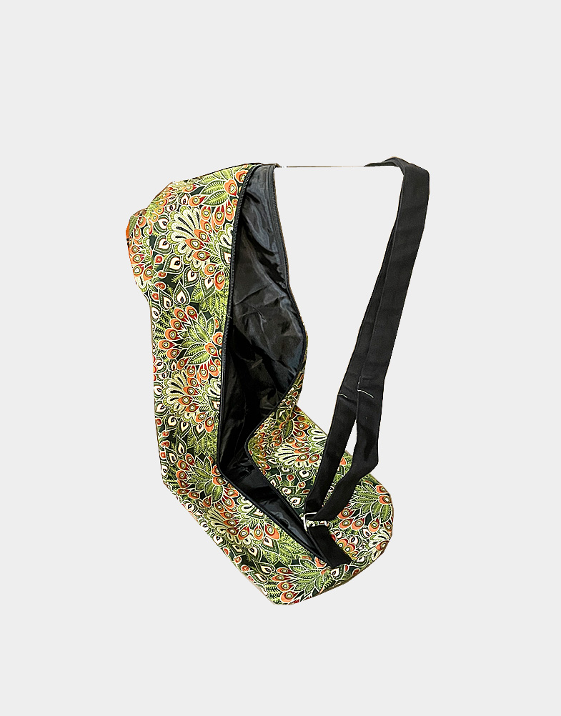 The green printed yoga mat bag is handmade in Thailand, a fair trade product. The occasional unevenness of color and slubs in this fabric should not be regarded as defects. They are characteristics of the natural yarns which give this fabric its rich and beautiful texture. Artist name Wei.