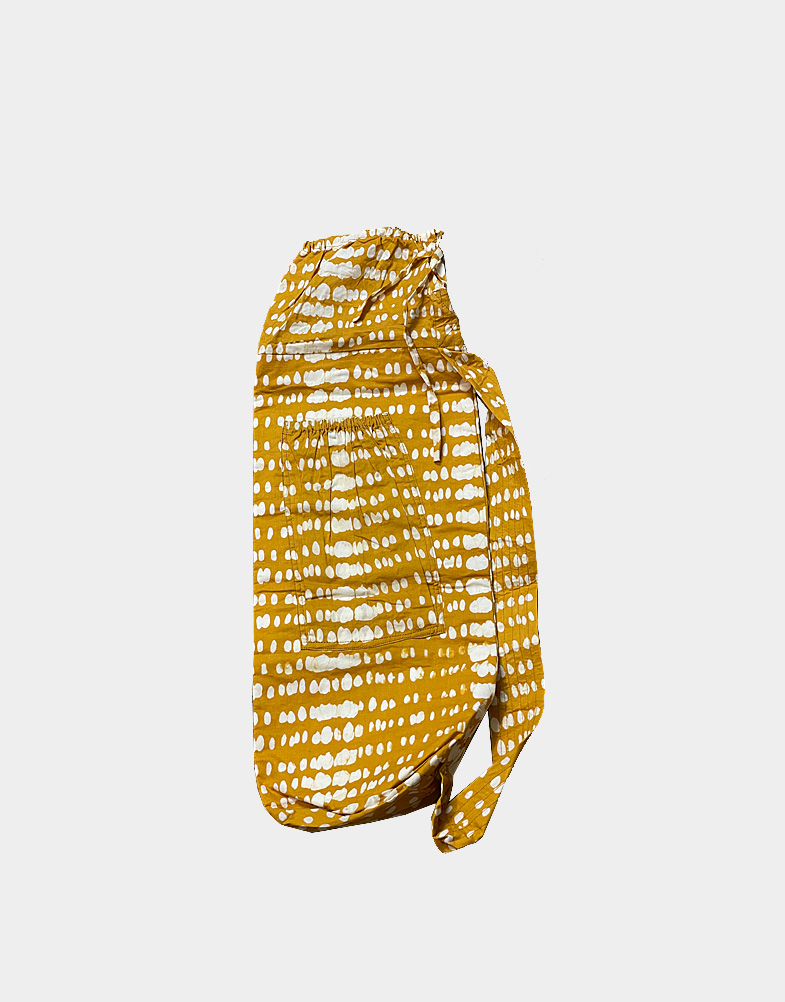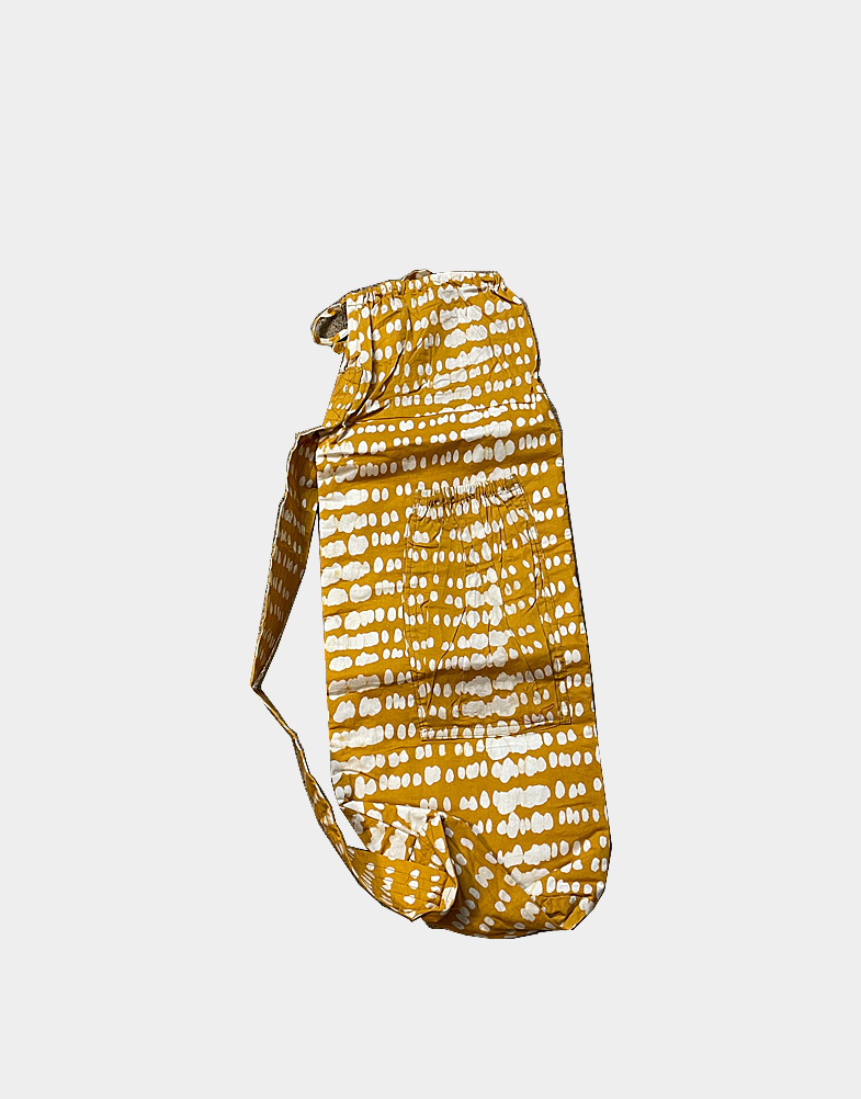 The mustard colored cotton yoga mat bag is handmade in Ghana, Africa by fair trade – Beautiful print of white dots on mustard background color, full cotton. Two outside pockets with an additional hidden safety pocket inside.
