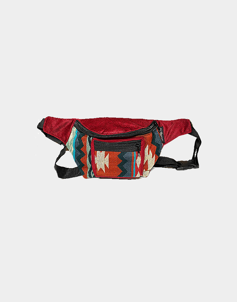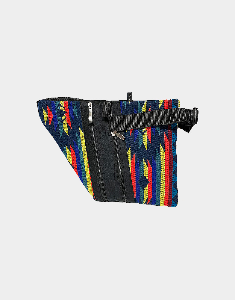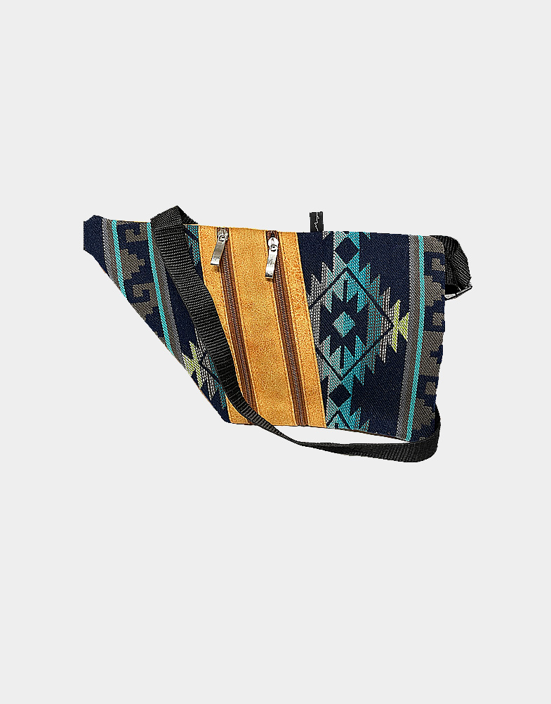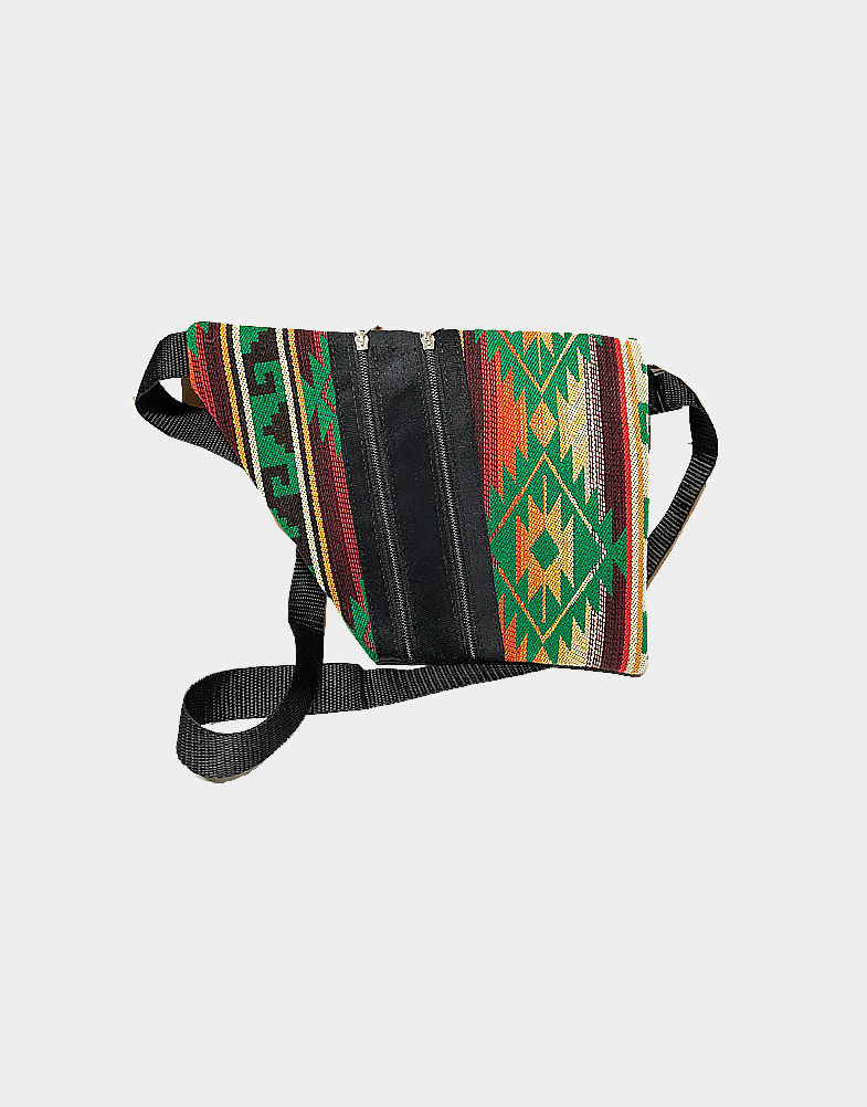 Quality suede leather and acrylic textiles made hip bags with two zippered compartments, one large pocket with a small front pocket. Chumbi textile accent. Adjustable buckle strap. Variety of patterns and colors. Made in Ecuador.