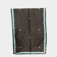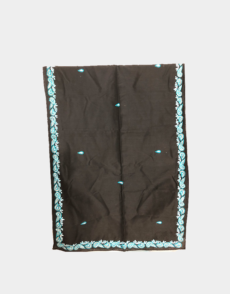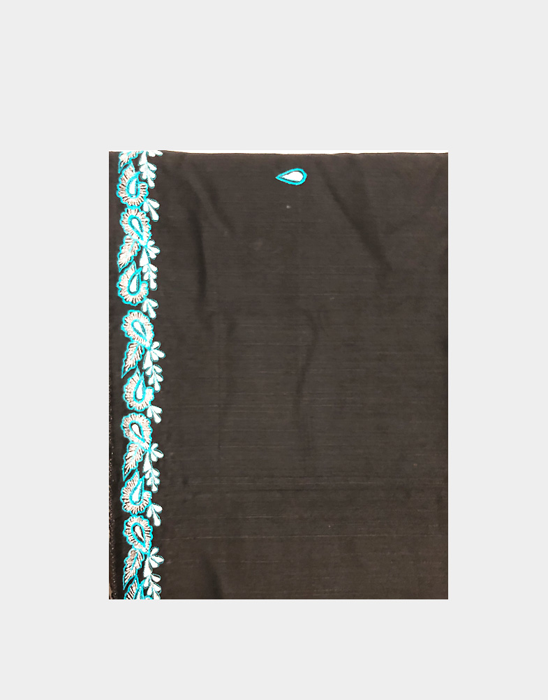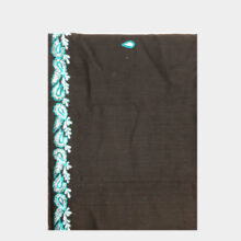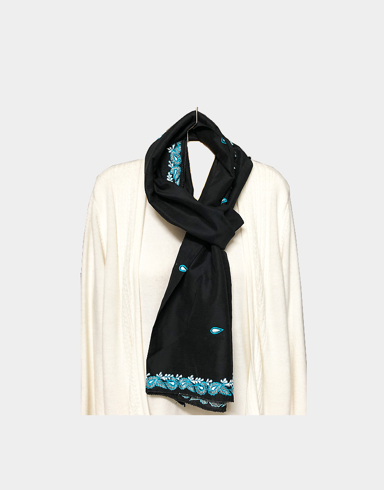This hand-woven, black Khadi silk (50% cotton-50% silk blend) scarf with turquoise blue machine embroidered nice border is exquisitely soft to touch and lightweight. A very attractive scarf that can be worn with any type of formal outfit and on any occasion.