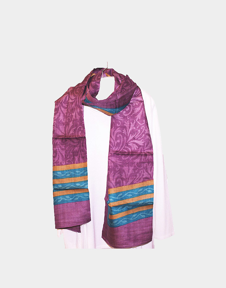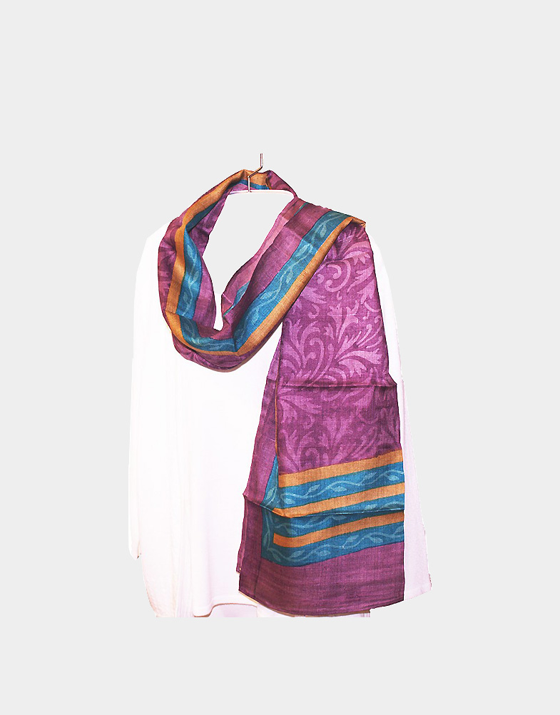 A tassar silk dye to nice subdued purple color and then hand block printed with traditional Indian flower motif on it. This scarf exclusively made from India. The border is til green alternated with pale yellow. This scarf is very light weight and can go with any kind of outfits.