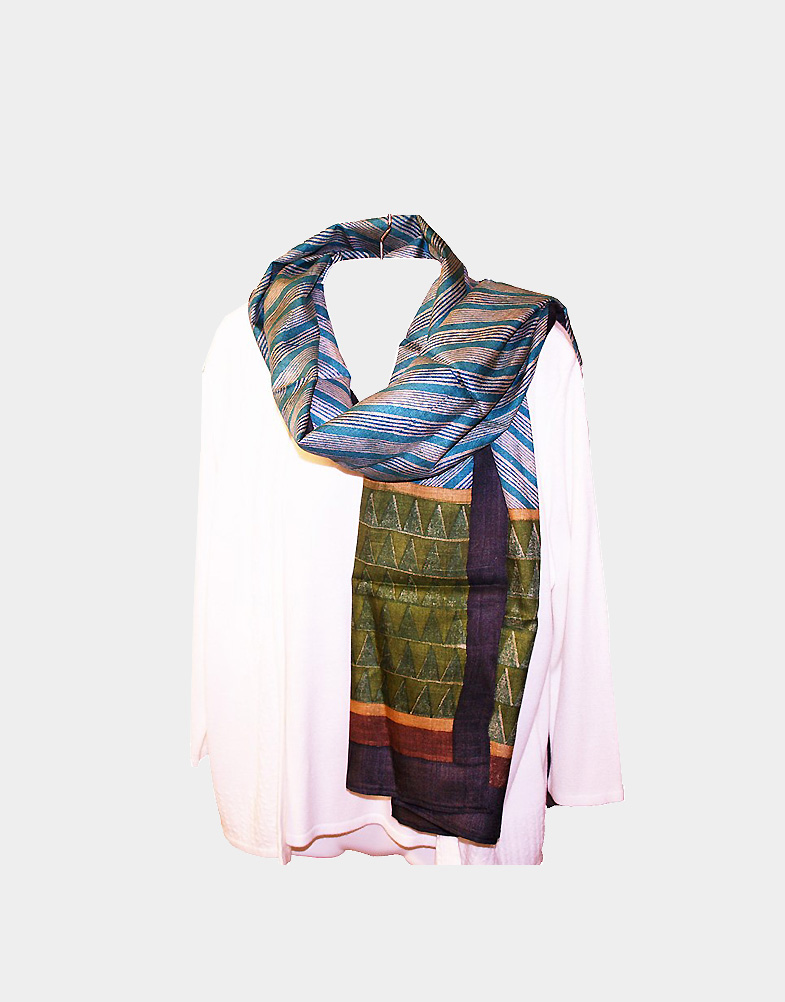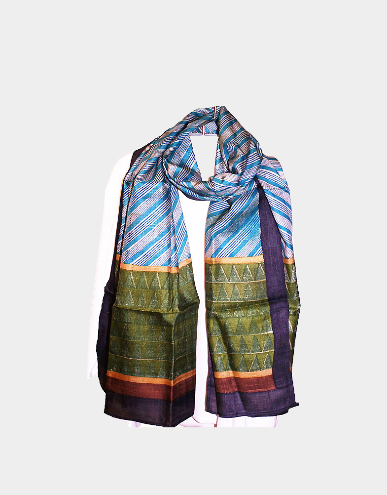 This blue green hand dyed silk scarf is one of a kind. This light weight silk scarf has blue and white stripes running diagonally all across. The broad green border uplifts the look of the scarf. The scarf acts as a wonderful accessory for any outfit.