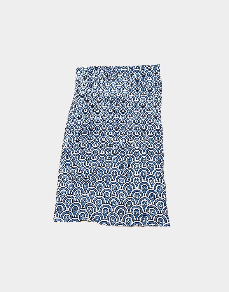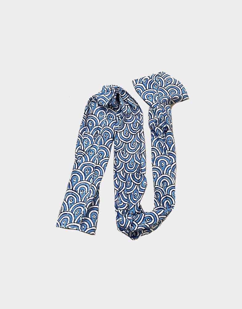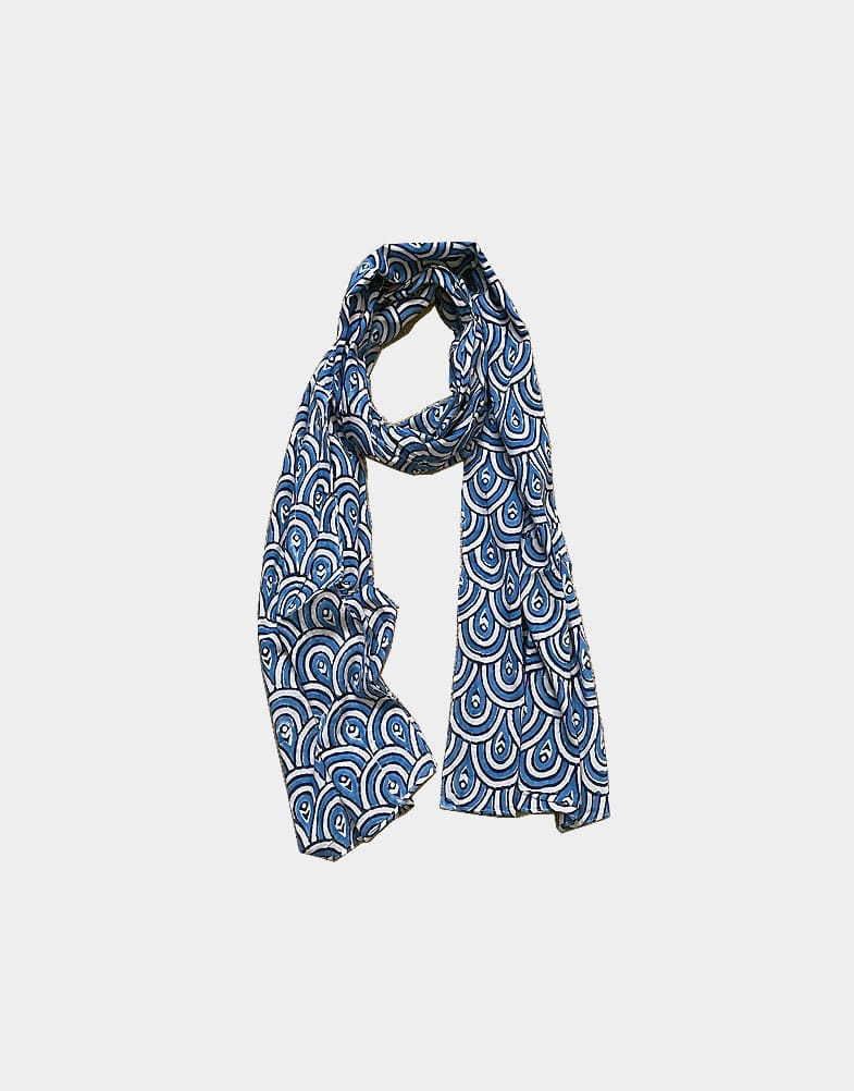 A light-weight ethical cotton scarf that features a blue and white block print that we call the peacock print. This scarf is 100% cotton and hand block printed in India.