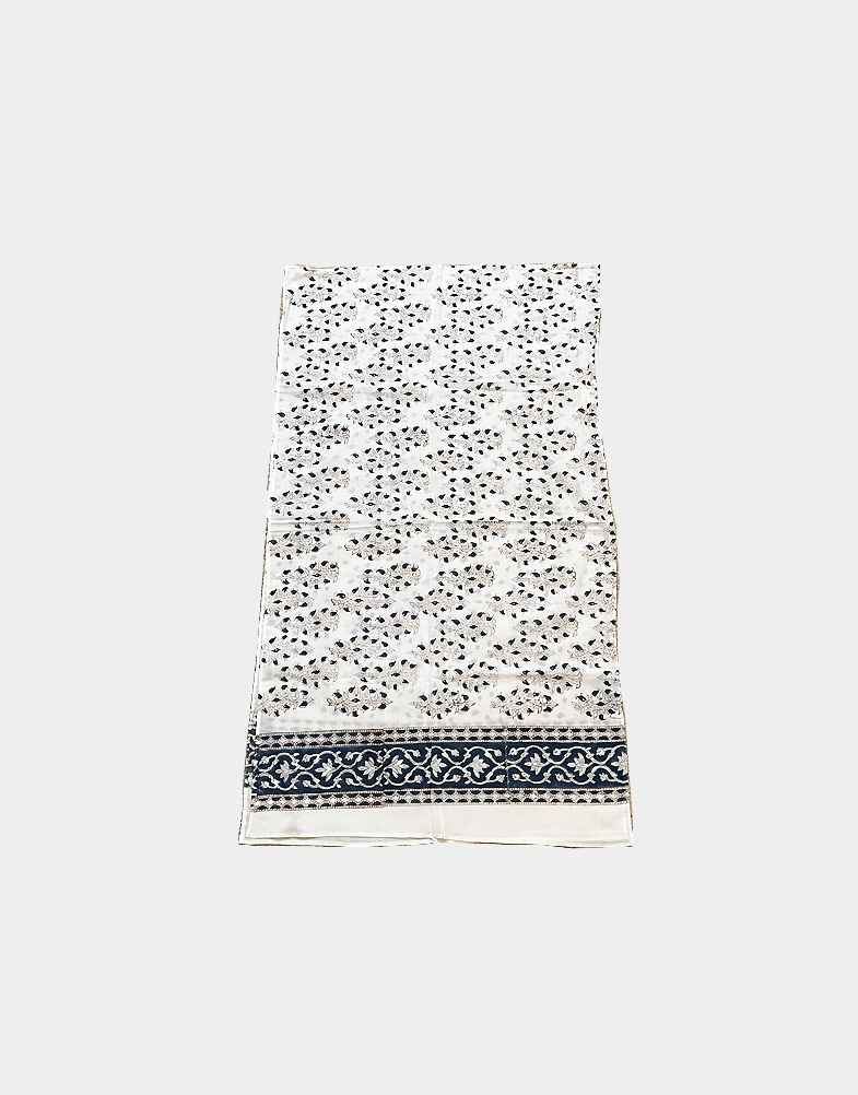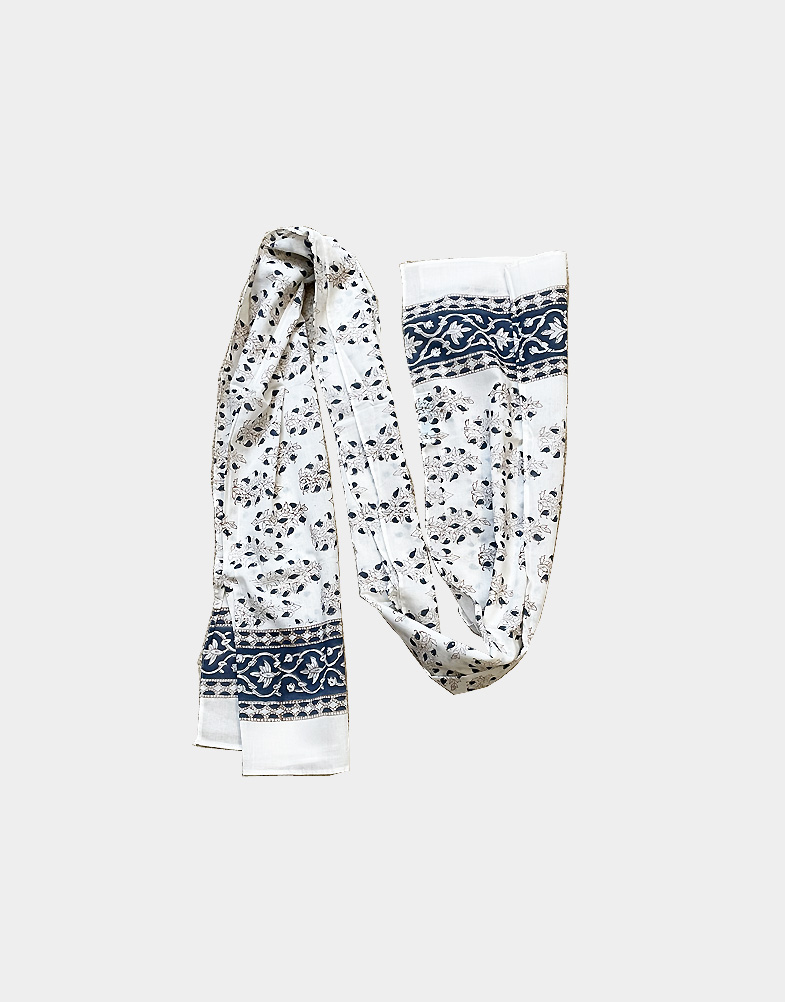 A light weight and ethically made cotton scarf that features a blue floral hand block print on white base and nice blue border on both ends of the scarf.