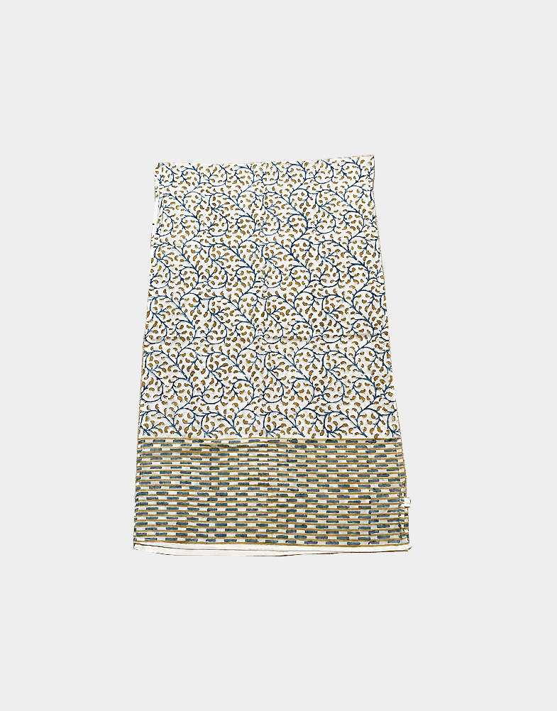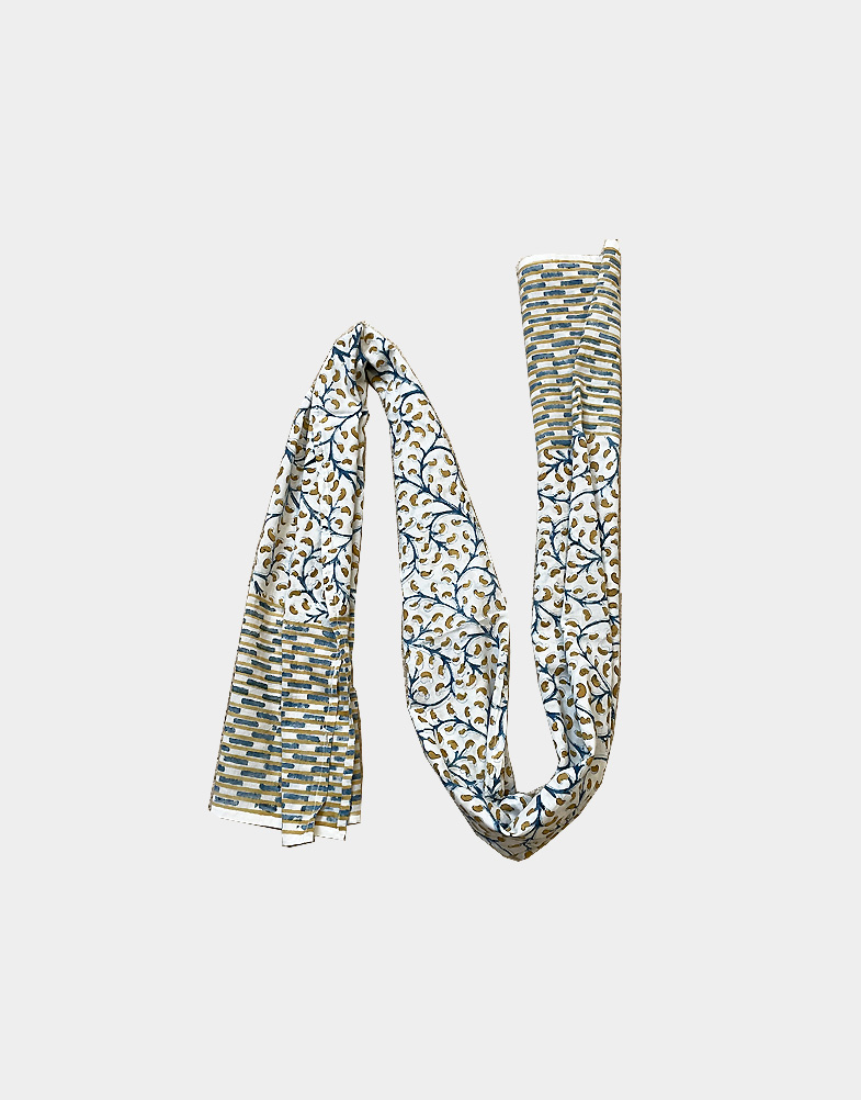 A light-weight and ethically made cotton scarf with a blue and yellow vine block print. It has brick style printed border on both ends of the scarf.
