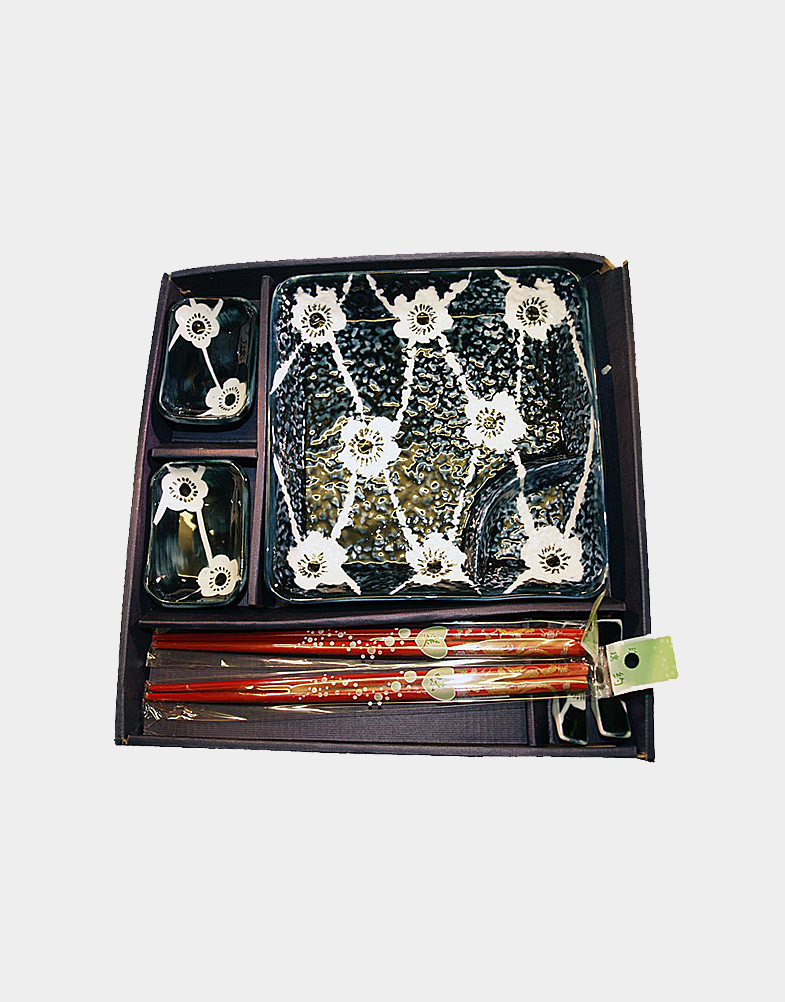 This orient inspired seven pieces Sushi dinner set consists of one sushi plate, two saucers, two pairs of chopsticks and two holders. Its superior quality and elegant design makes it perfect for everyday use. Can be great for a present too. Color is blue base with white flower motif.