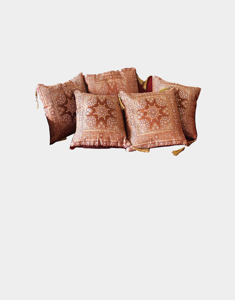 Sewn on dark brown silk, these brocade sequined cushion covers exemplify the intricate silk thread work of skilled Indian craftsmen and women.