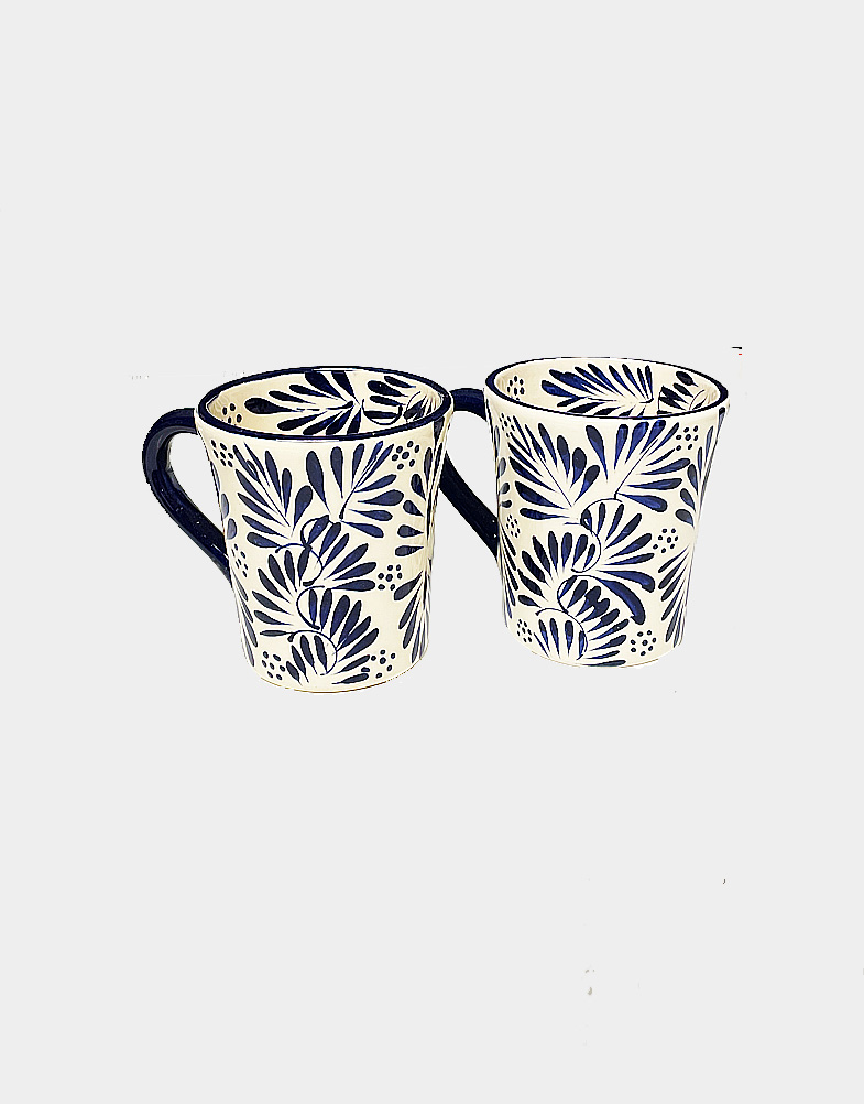 These richly-colored Encantada coffee mugs are handcrafted and painted by Mexican artisans. The outside, inside, and handle are covered with a blue “plumedo” pattern, each piece is unique and very functional.