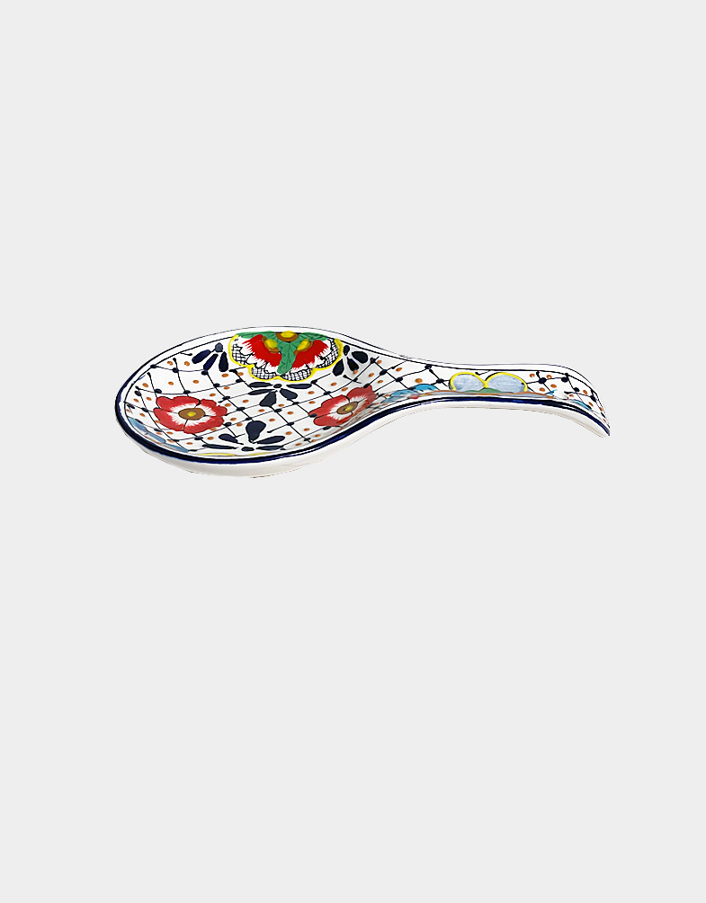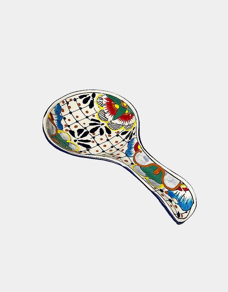This authentic Mexican pottery is crafted and hand-painted by artisans using traditional pottery techniques. The piece doubles as a functional spoon holder or decorative wall display; a small hole on the handle makes hanging easy.