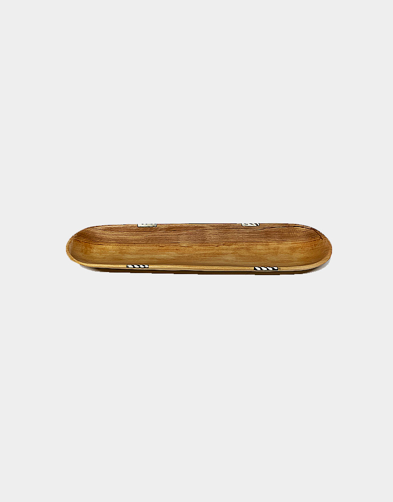 Artfully carved from a single piece of wild olive wood using simple hand tools by Kenyan artisans, these rustic snack trays showcase the beautiful natural wood-grain. Bone inlay accents feature batik art designs, adding a special touch. These may be used for entertaining or offer a unique design element for the home.