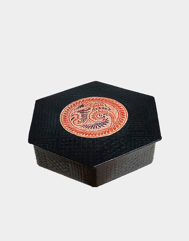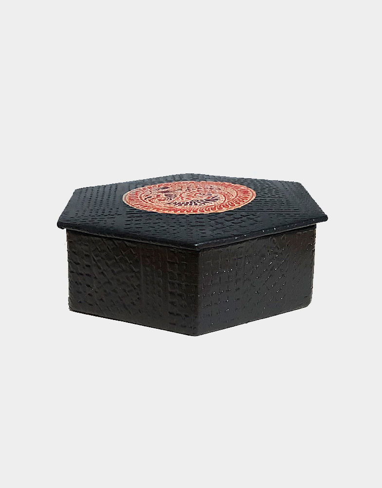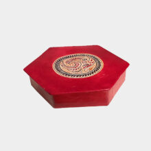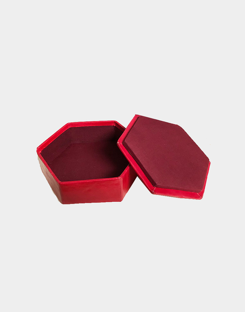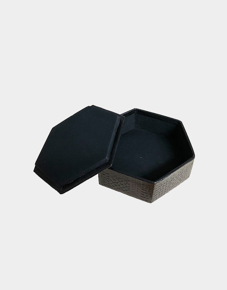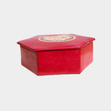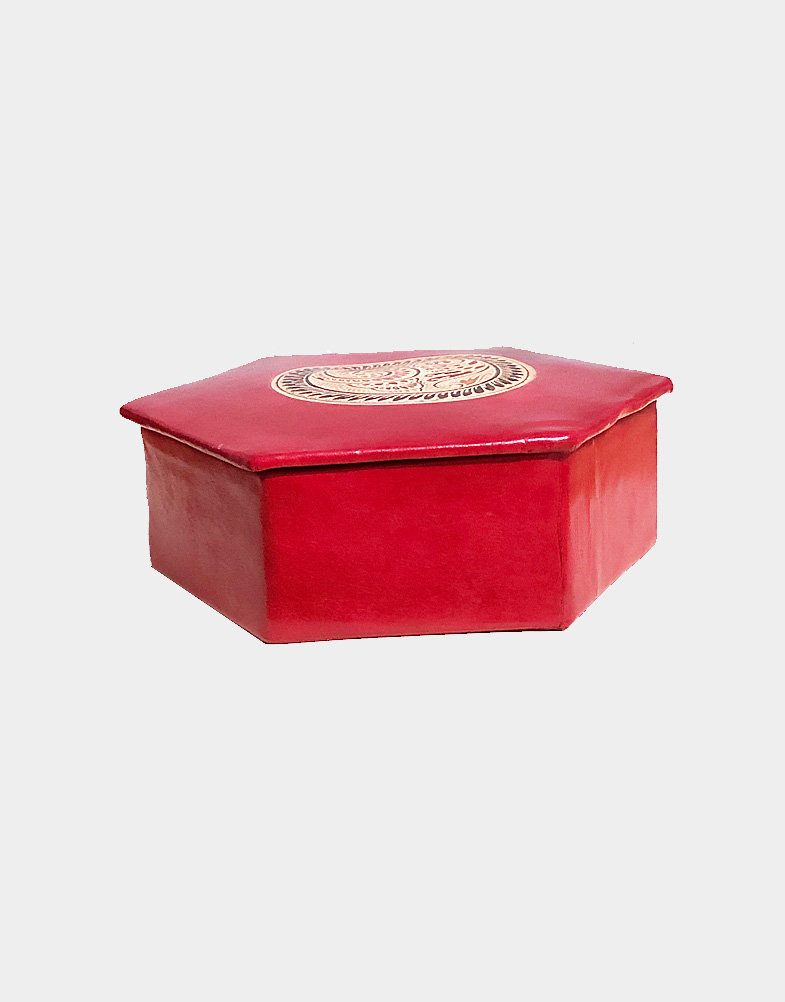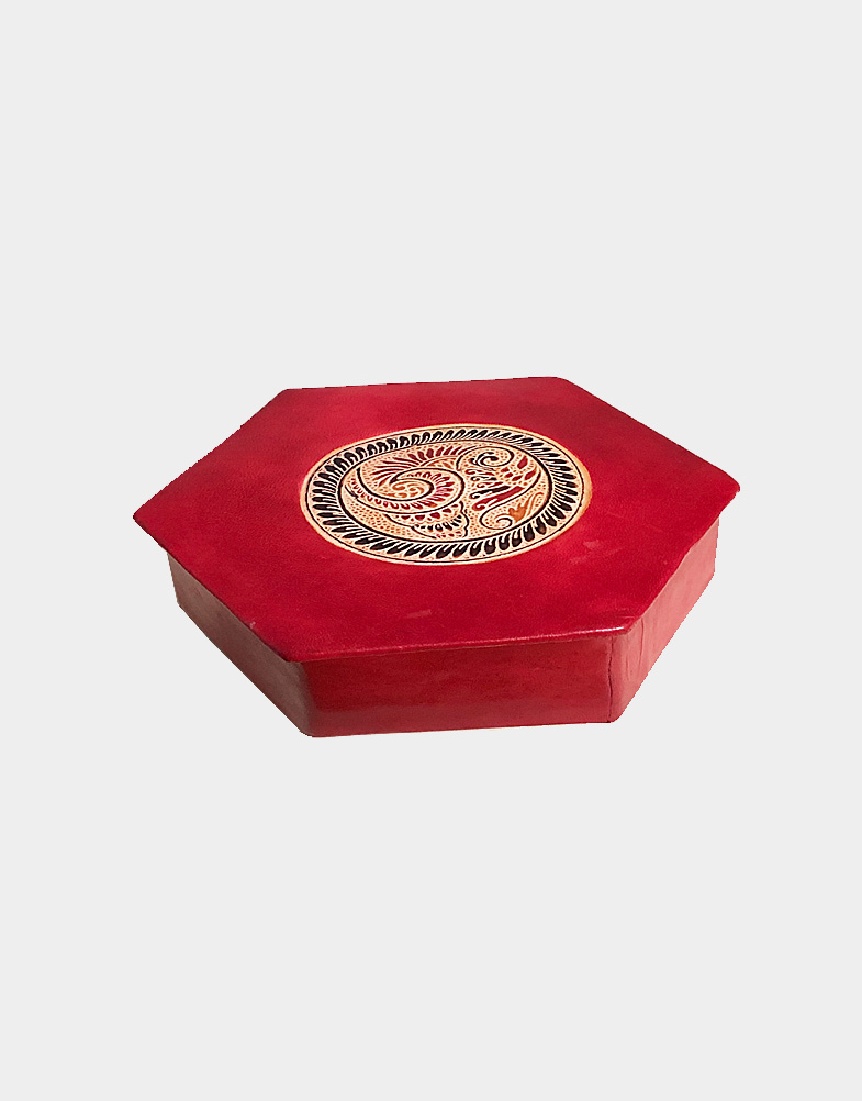 These hexagonal shaped leather jewelry boxes made in India. These are made with pure leather with embossed design with vegetable dye. The box has a grip for the lid to fix tightly.