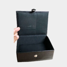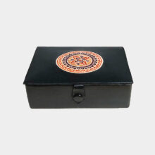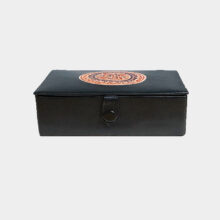 Black leather jewelry or trinket box with button in front. The artwork on top surface of box are done with vegetable dye. The leather used to make the boxes are from goat skin or sheep skin.