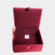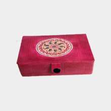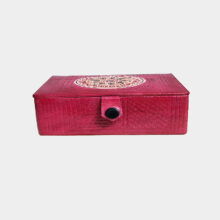 Textured red colored leather jewelry box with button in front, traditional Indian motif on top.