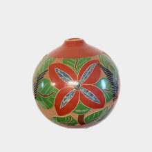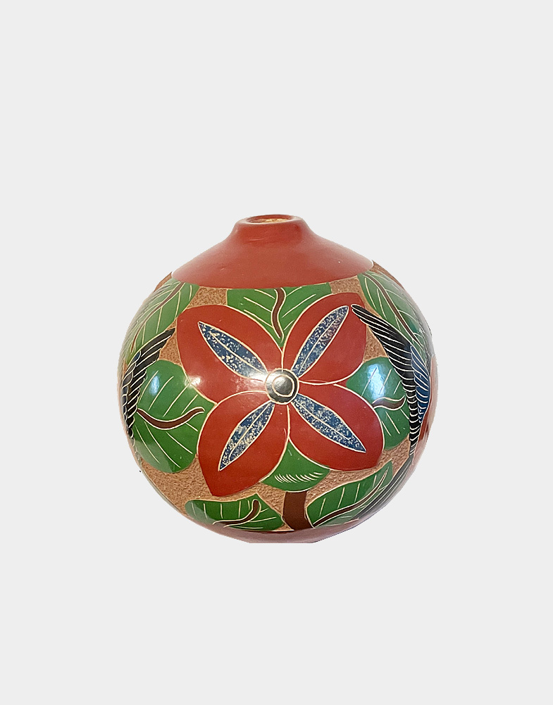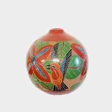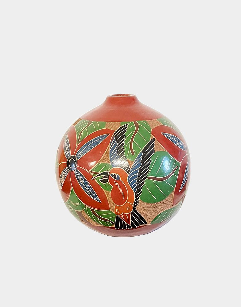 This decorative vase from Nicaragua is 5.5 inches tall and 5.5 inches in diameter, featuring a colorful flower and bird design.