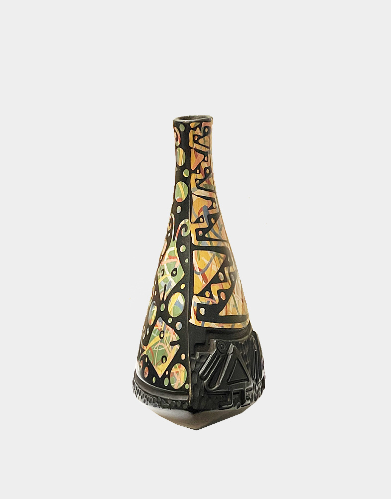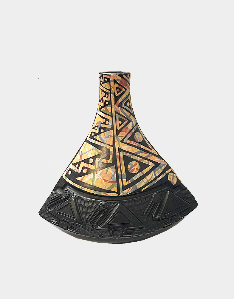 This authentic beautiful artwork is made by artisan from Peru, fully handcrafted in black and multi-color painting as well as hand carving. This special pottery is made in Chulucanas town in Peru, famously known as Chulucana Pottery. Signed by the artist Rogger Crisanto. Dual design on two sides of the pottery gives an uniqueness to the piece.