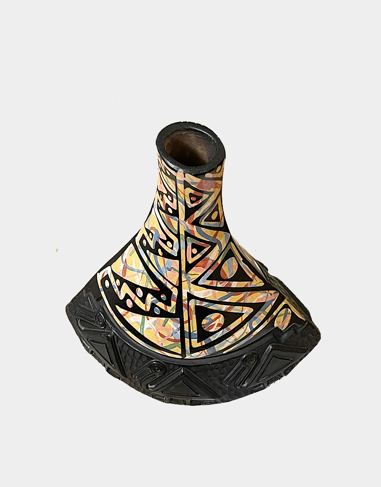 Chulucanas pottery were developed by using techniques from pre-Inca times. These unique ceramic pieces are thrown and smoothed totally by hand. A liquid clay slip is placed over the exterior. Liquid clay is used to cover with minerals and herbs those areas or designs that they want to keep intact in color. The areas they want to darken, are exposed. The piece decorated this way enters the smoking oven, where mango leaves have been used. When the ceramics are dry, they go to the wood oven and burn at a temperature of between 700 and 900°C approx. During this reduction burning, the mango leaf used as fuel will generate smoke that will darken the ceramic, and will also produce a resin that, when adhered to the ceramic, will give it the characteristic shine of Chulucanas style. This reduction burn is done 2-3 times depending on the desired dark tone, achieving a wide range of brown tones until reaching solid black.