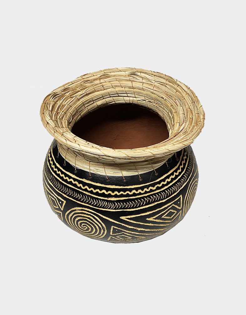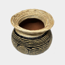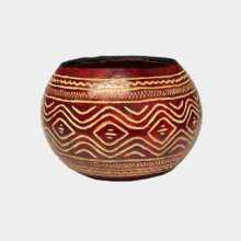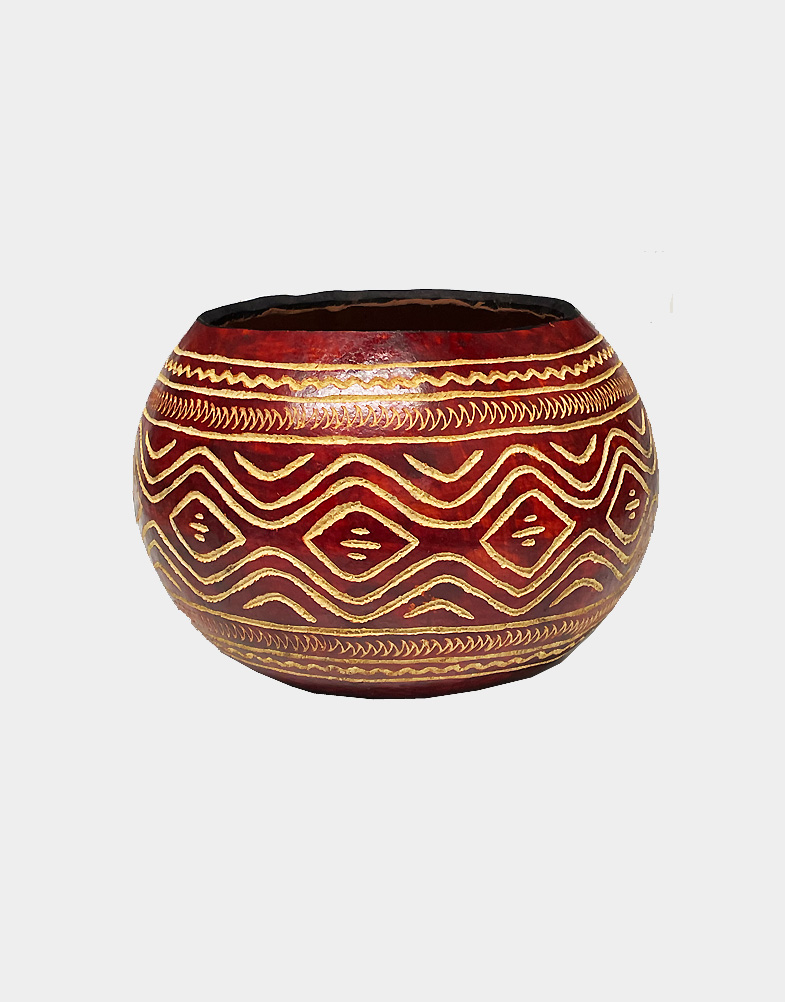 Kenyan artisans create stylish desktop storage vessels from dried calabash gourds, which grow abundantly in the Kenyan countryside. Each vessel is dyed to an earthy brown or red dye hue, then etched with assorted safari-inspired designs.