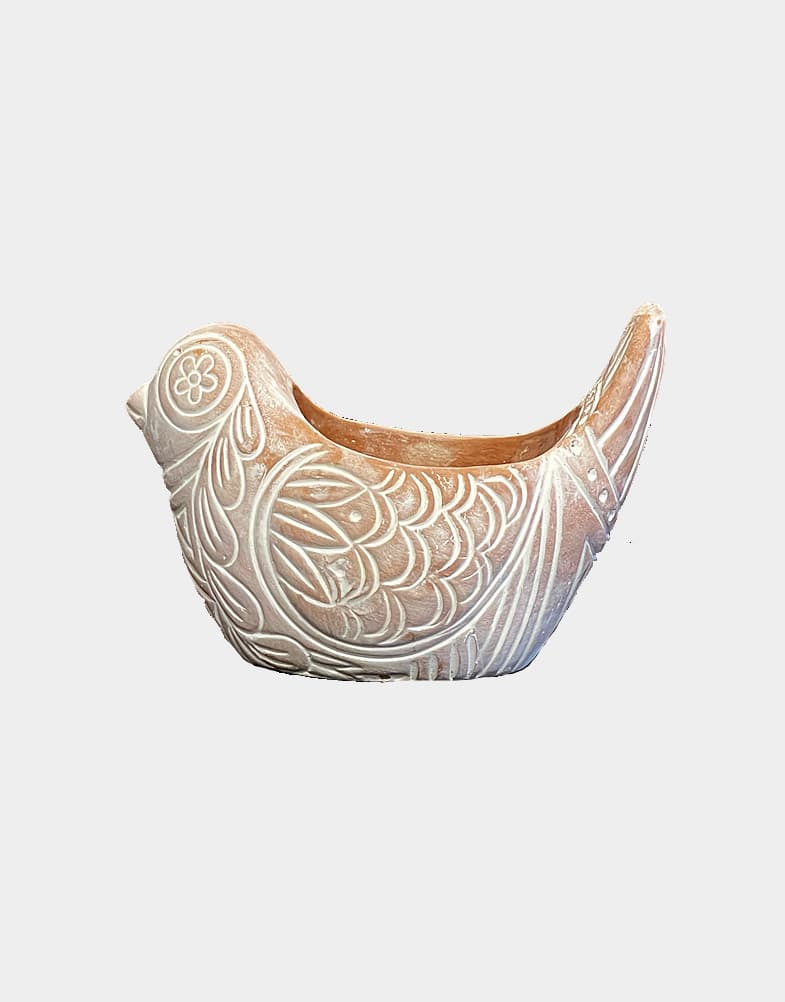 These terracotta bird planters (sold individually) are hand etched with traditional designs and finished with contrasting whitewash, made in Bangladesh. Interior has a clear waterproof finish.