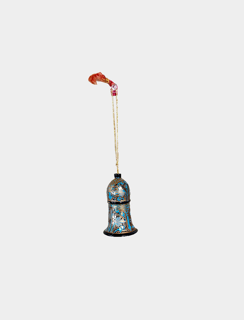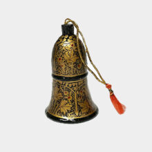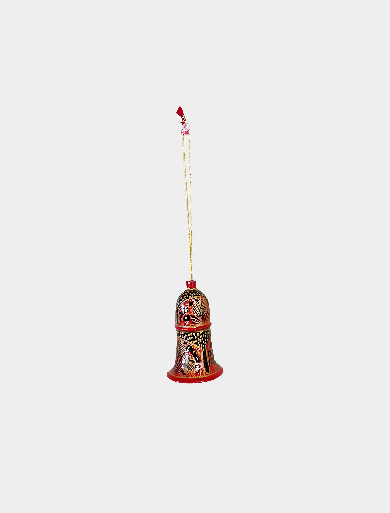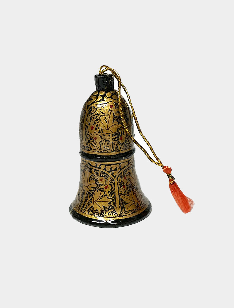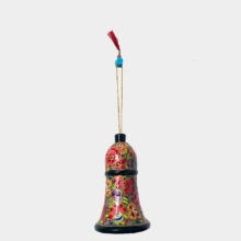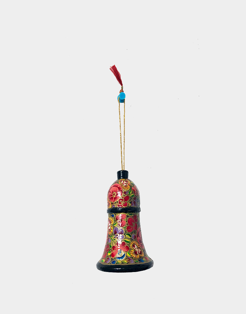 These Christmas ornaments are made of papier mache, completely hand crafted, hand painted with floral motifs. Papier mache is much lighter so easy to hang on the Christmas trees. Each bell has a small bell inside and a golden cord for hanging with a red tassel. Made in Kashmir, India.
