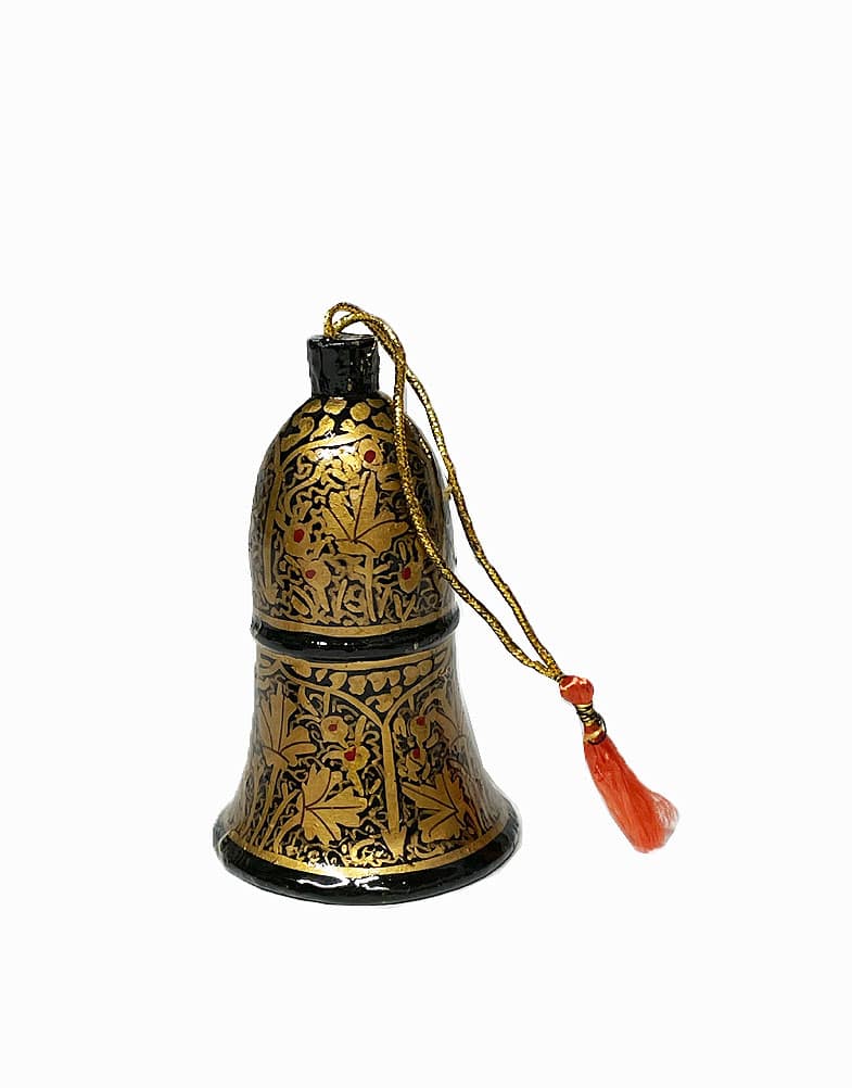 This Christmas ornament is made of papier mache, completely hand crafted, hand painted with floral motifs on golden color on black. Papier mache is much lighter so easy to hang on the Christmas trees. Each bell has a small bell inside and a golden cord for hanging with a red tassel. Made in Kashmir, India.
