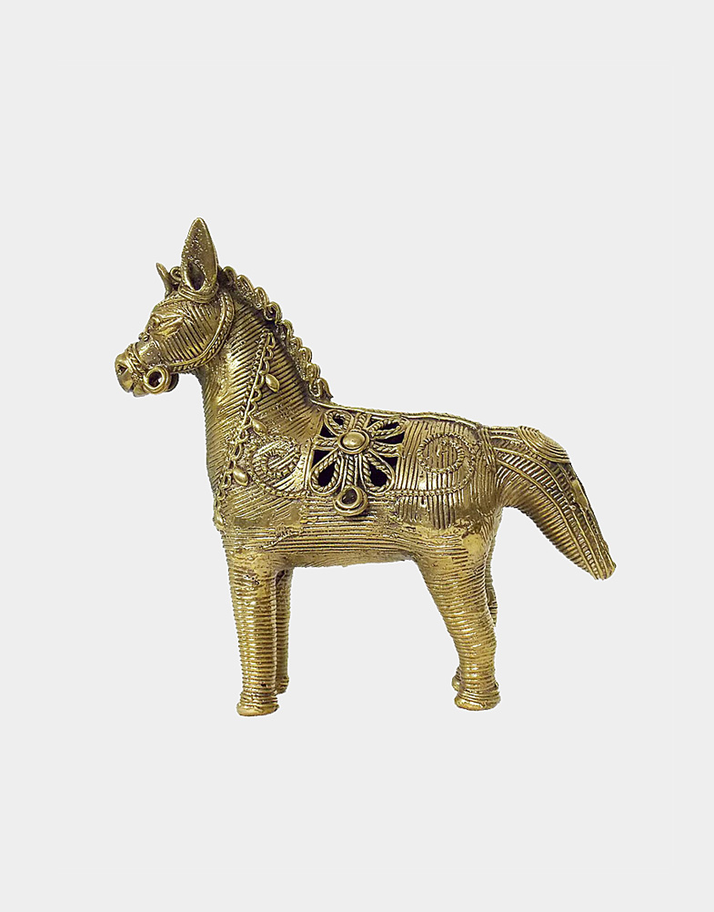 Dhokra is non-ferrous metal casting using the lost-wax casting technique. An art that is 4000-5000 years old. Dhokra is the most popular of all other tribal crafts. The name comes from the Dhokra tribes, the metal-workers of Bastar, Chhattisgarh. This sort of metal casting has been used in India and is still used. Dhokra is an alloy of brass, nickel and zinc that gives an antique effect to the castings. There are two main processes of lost wax casting- solid casting and hollow casting. First a mold is prepared out of wet earth, or with Lac or with a combination of bee wax, Sal resin and dhuna. Then the required design is hand created on the mold with bee-wax and Lac. It is then again covered with wet earth and is bind with iron wire. Again a layer of earth is put on the mold after which a hole is made in the mold. It is then heated which melts the wax or the Lac, and the liquid brass is filled in the mold through the hole. The mold is then left to cool down and the artwork is obtained by breaking the mud mold. All Dhokra products are traditional craft and 100% eco-friendly. Crafting a single figurine is incredibly time consuming and requires a great degree of skill and patience. Normally, a simple figurine could take anywhere between over fifteen to thirty days to make.