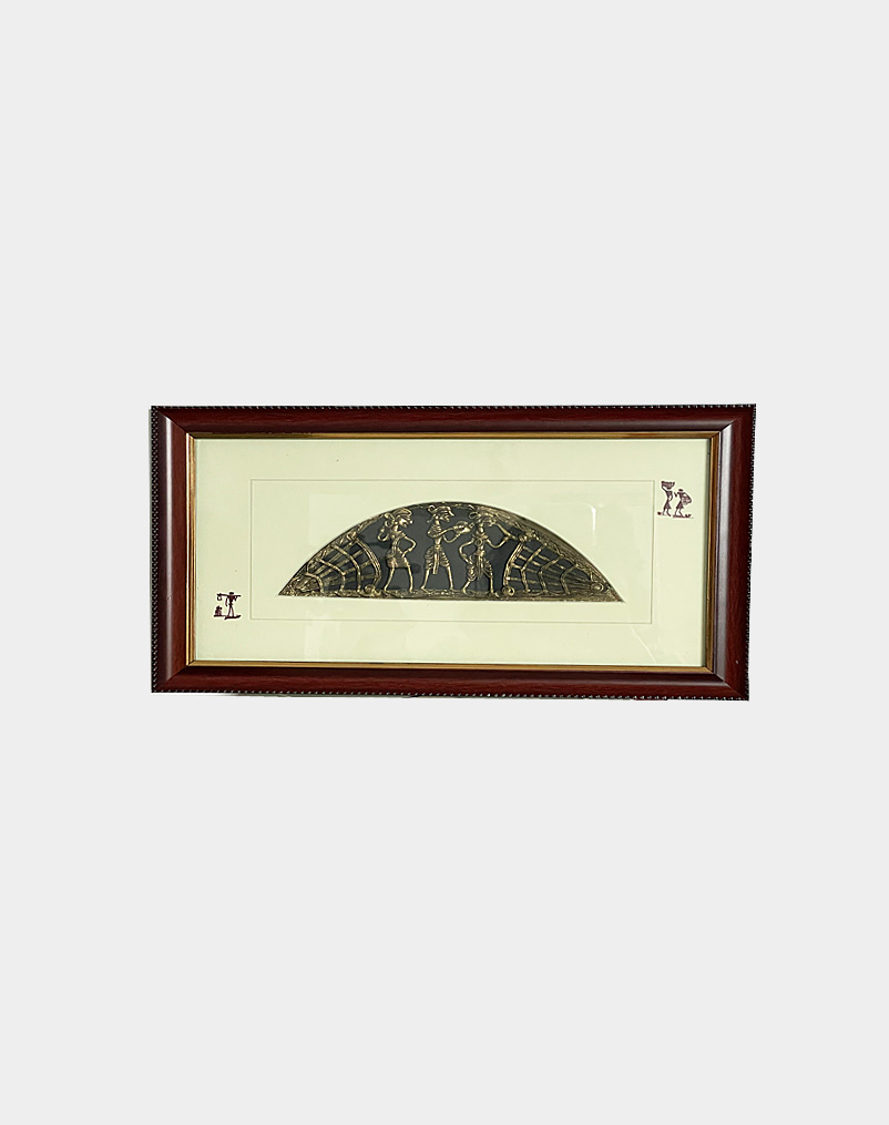 Wonderful collection of handmade Dhokra paintings from the tribes of India. Each painting tells a story of the rural tribes (Man & Woman) doing daily life activities or enjoying life with dancing or playing music. The artwork is fully handmade with brass dhokra rustic. Nicely framed in dark wood, these dhokra paintings are a rare collection for your home interior.