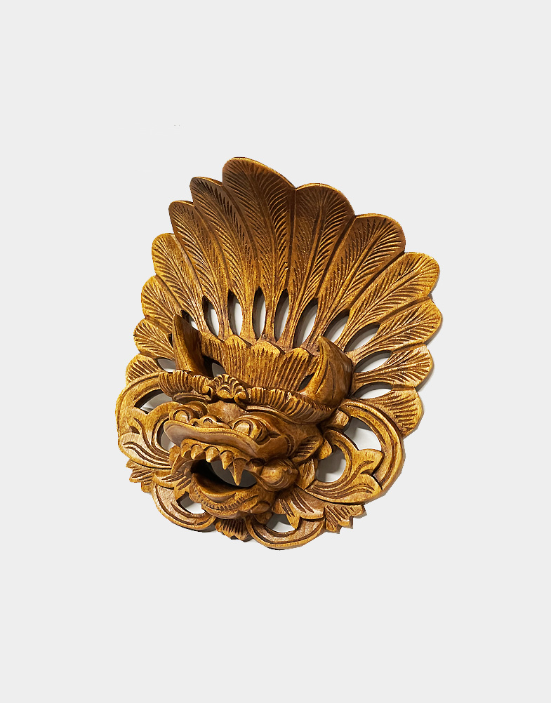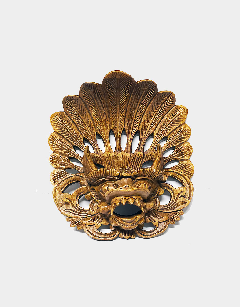 Barong appears in this fascinating wall sculpture from Eka. Also known as Bhoma, he represents the goodness that destroyed the evil Rangda. His adventures are reenacted in the form of a dance and his image is also hung on doors in Bali to ward off evil spirits.
