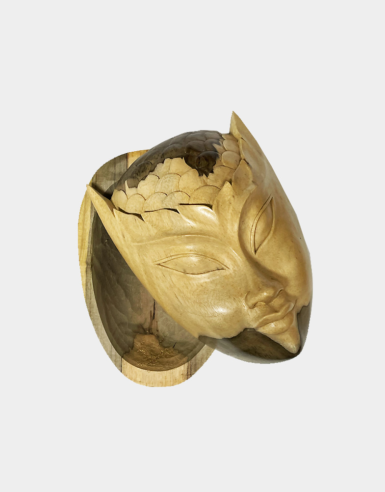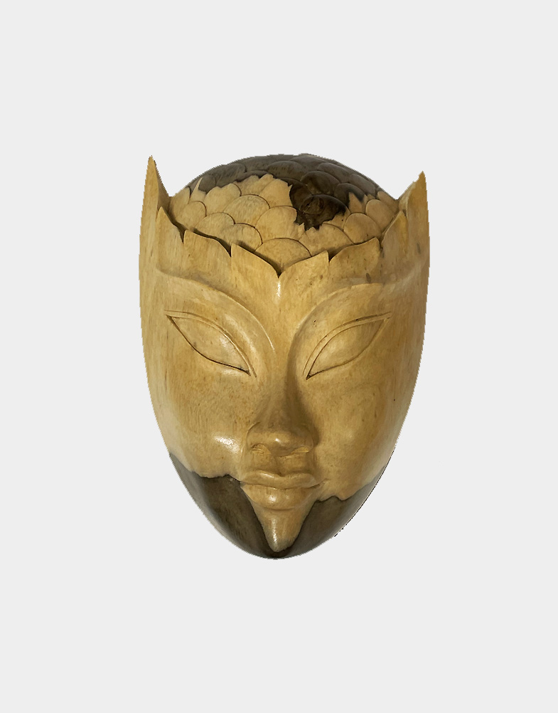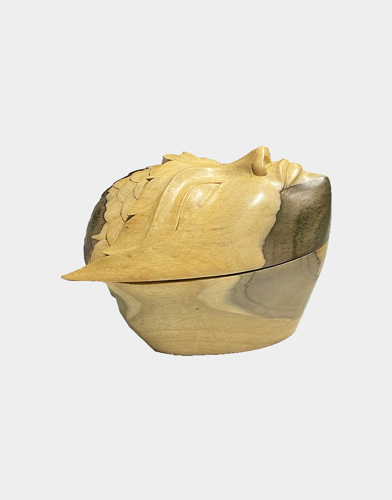 The artisan hand carves the box from hibiscus wood with a beautiful natural grain, depicting a devilish face that watches over your belongings with a vigilant gaze. Nyoman Lasia in Bali designs a spooky decorative box to hold all your little trinkets. Made in Indonesia.