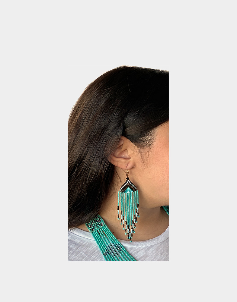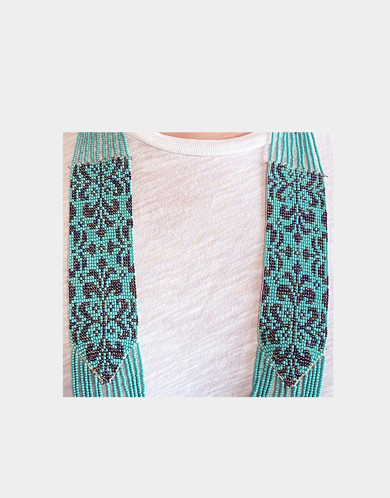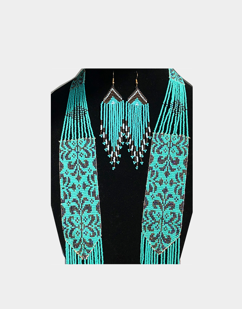 This fashionable necklace set is made by Kuki tribe women of Nagaland, India. The necklace and earrings are made with small aqua green and chocolate colored seed beads, which are woven in intricate geometric lace designs.