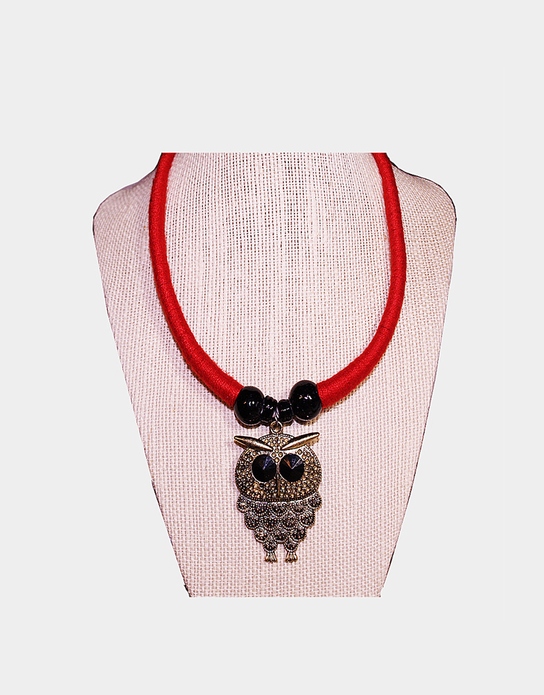 This wide-eyed owl pendant necklace is sitting pretty waiting to be adored. The metallic finish gives this pendant a universal appeal. The necklace length is made of knitted orange silk thread.